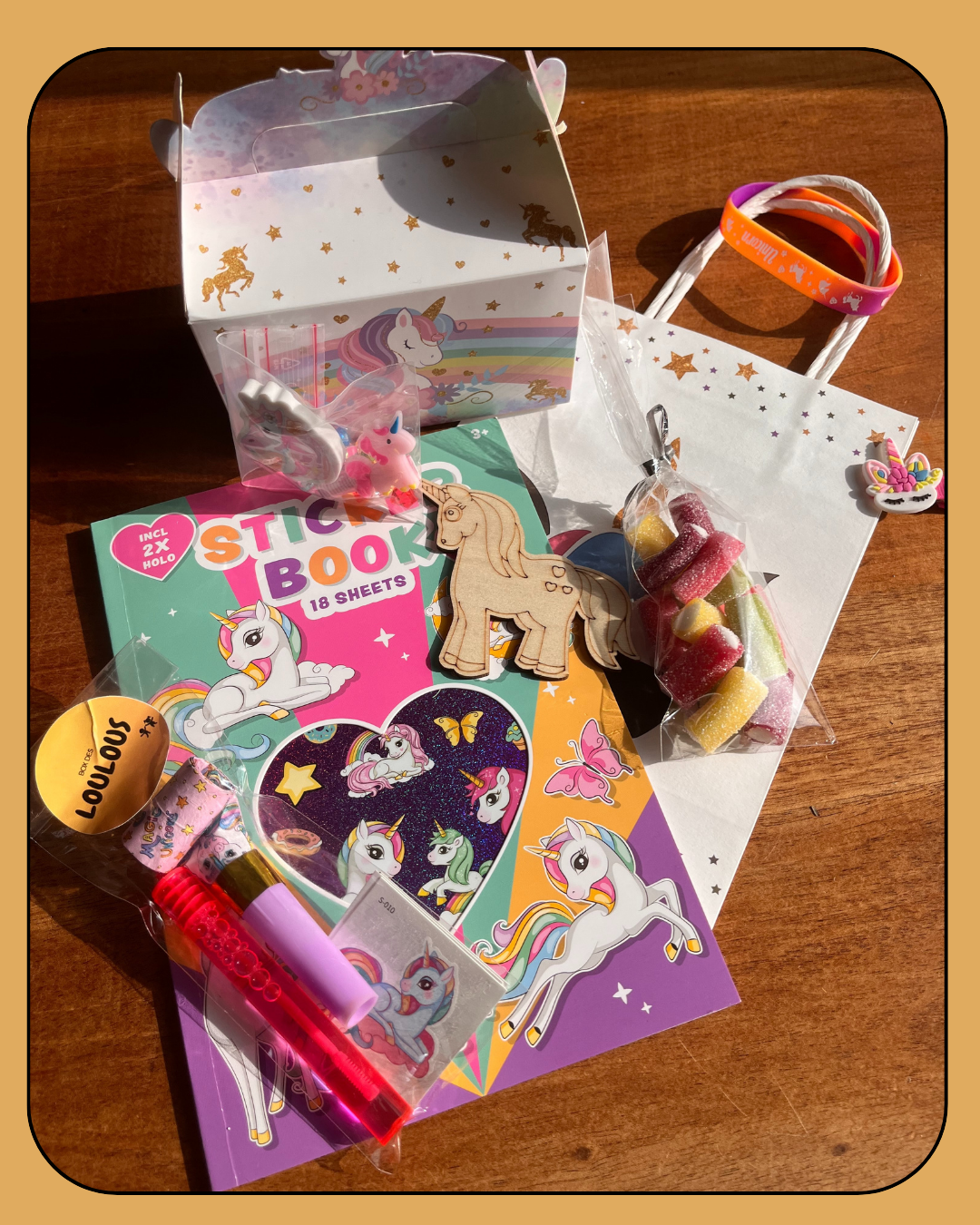 🎁 Et pour finir en beauté, chaque enfant repart avec son sac-surprise licorne rempli de magie : gommettes licorne, tatouages licorne, bonbons, flacon à bulles et un joli sifflet de fête 🌟.